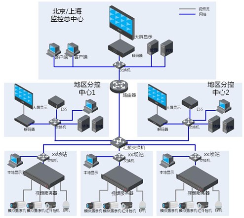 本系統(tǒng)由一級(jí)總控中心、二級(jí)地區(qū)分控中心、站場(chǎng)閥室基層系統(tǒng)三級(jí)結(jié)構(gòu)。三級(jí)視頻監(jiān)控的視頻監(jiān)控系統(tǒng)經(jīng)該二級(jí)地區(qū)分控中心上聯(lián)一級(jí)總控中心。