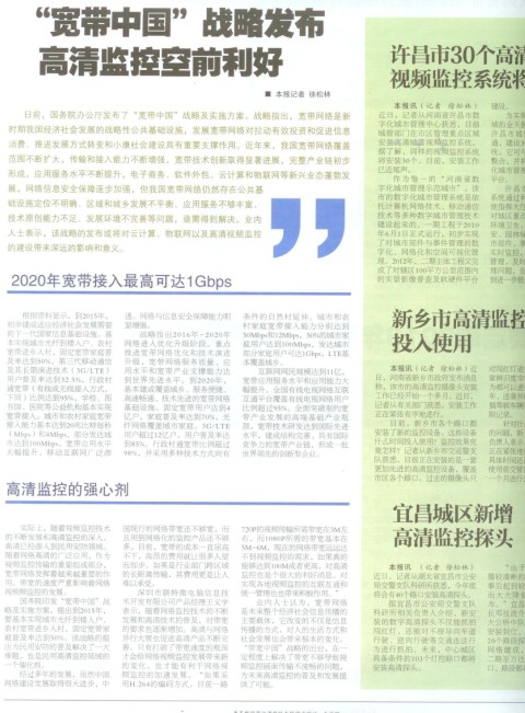 國務院印發“寬帶中國”戰略及實施方案,提出到2015年,要基本實現城市光纖到樓入戶、農村寬帶鄉入村,固定寬帶家庭普及率達到50%。該戰略的提出為民用的普及解決了一大難題,也是民用高清監控領域的一個催化劑。