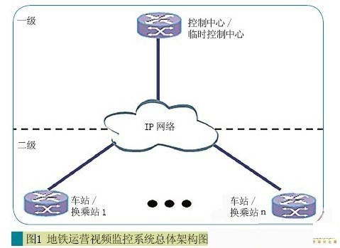 其中運(yùn)營(yíng)視頻監(jiān)控系統(tǒng)為二級(jí)架構(gòu),在車站/換乘站設(shè)立二級(jí)監(jiān)控中心,負(fù)責(zé)監(jiān)控本站相關(guān)情況,在控制/備用中心設(shè)立一級(jí)監(jiān)控中心,負(fù)責(zé)整個(gè)線路的遠(yuǎn)程監(jiān)控,架構(gòu)示意如圖1所示。