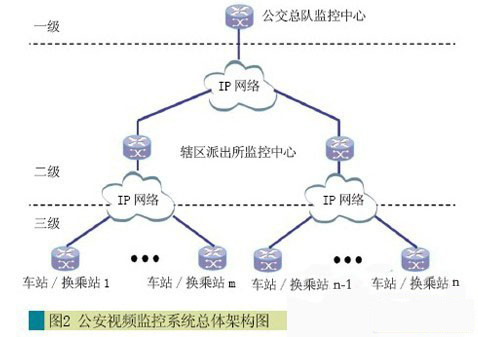 公安視頻監(jiān)控系統(tǒng)為三級(jí)架構(gòu),在車站/換乘站公安值班室設(shè)立三級(jí)監(jiān)控中心,負(fù)責(zé)監(jiān)控本站相關(guān)情況,在派出所設(shè)立二級(jí)監(jiān)控中心,負(fù)責(zé)監(jiān)控轄區(qū)所在車站/換乘站相關(guān)情況,在公交總隊(duì)設(shè)立一級(jí)監(jiān)控中心,負(fù)責(zé)整個(gè)線路的遠(yuǎn)程監(jiān)控,架構(gòu)示意如圖2所示。