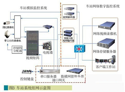 現(xiàn)階段地鐵交通視頻監(jiān)控系統(tǒng)中,會(huì)牽涉大量的模擬視頻設(shè)備和數(shù)字視訊設(shè)備,典型的模擬設(shè)備有矩陣、字符迭加器、模擬攝像機(jī)、云臺(tái)、多畫面分割器等,典型數(shù)字設(shè)備有網(wǎng)絡(luò)視頻錄像機(jī)、存儲(chǔ)服務(wù)器、安防平臺(tái)服務(wù)器、安防管理服務(wù)器、接口網(wǎng)關(guān)、磁盤陣列、編碼器、譯碼器、數(shù)字回放終端等。該方案能夠使這些數(shù)字和模擬設(shè)備融合在一個(gè)系統(tǒng)中,使兩者之間能夠互聯(lián)互通、互訪互控。
